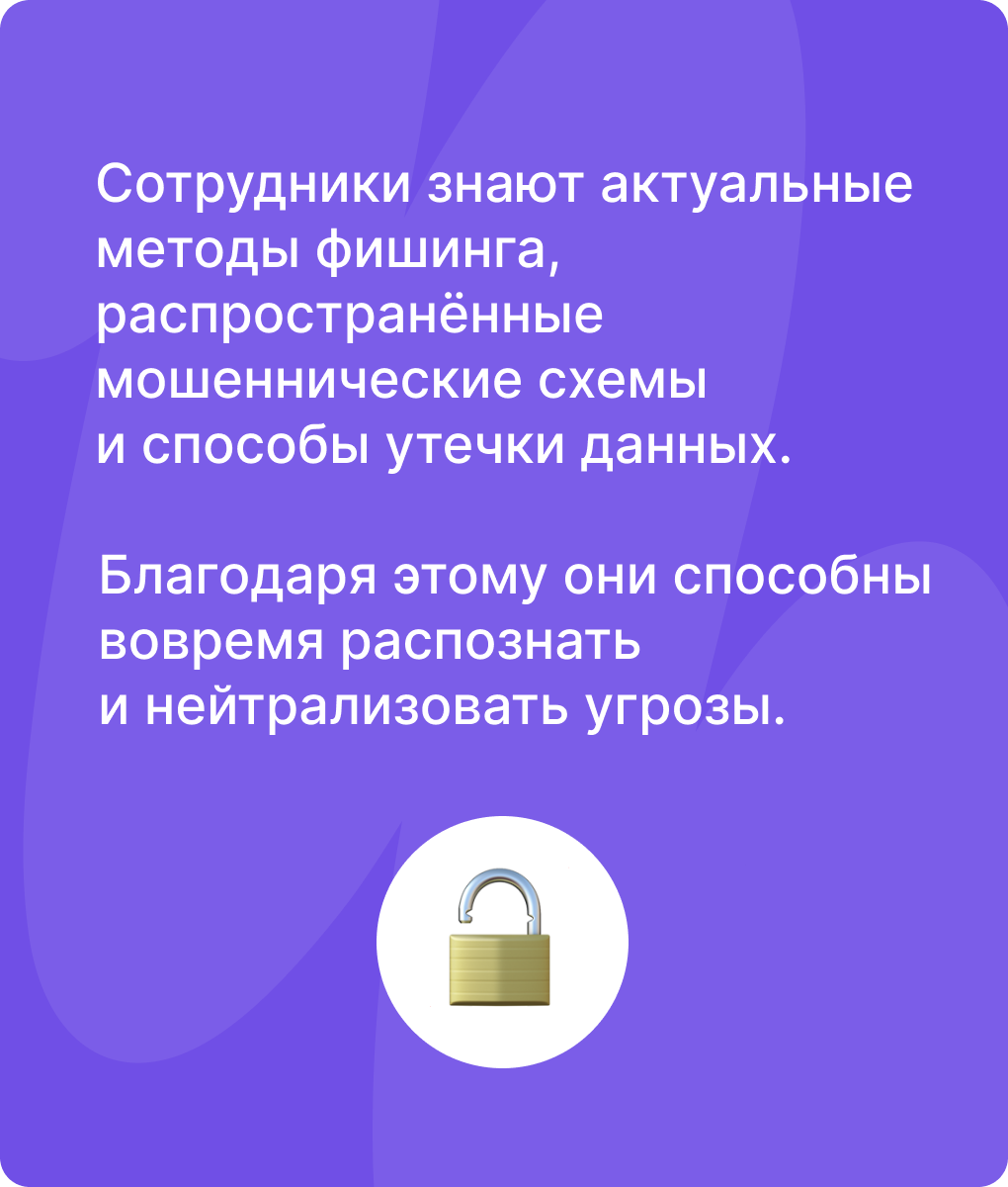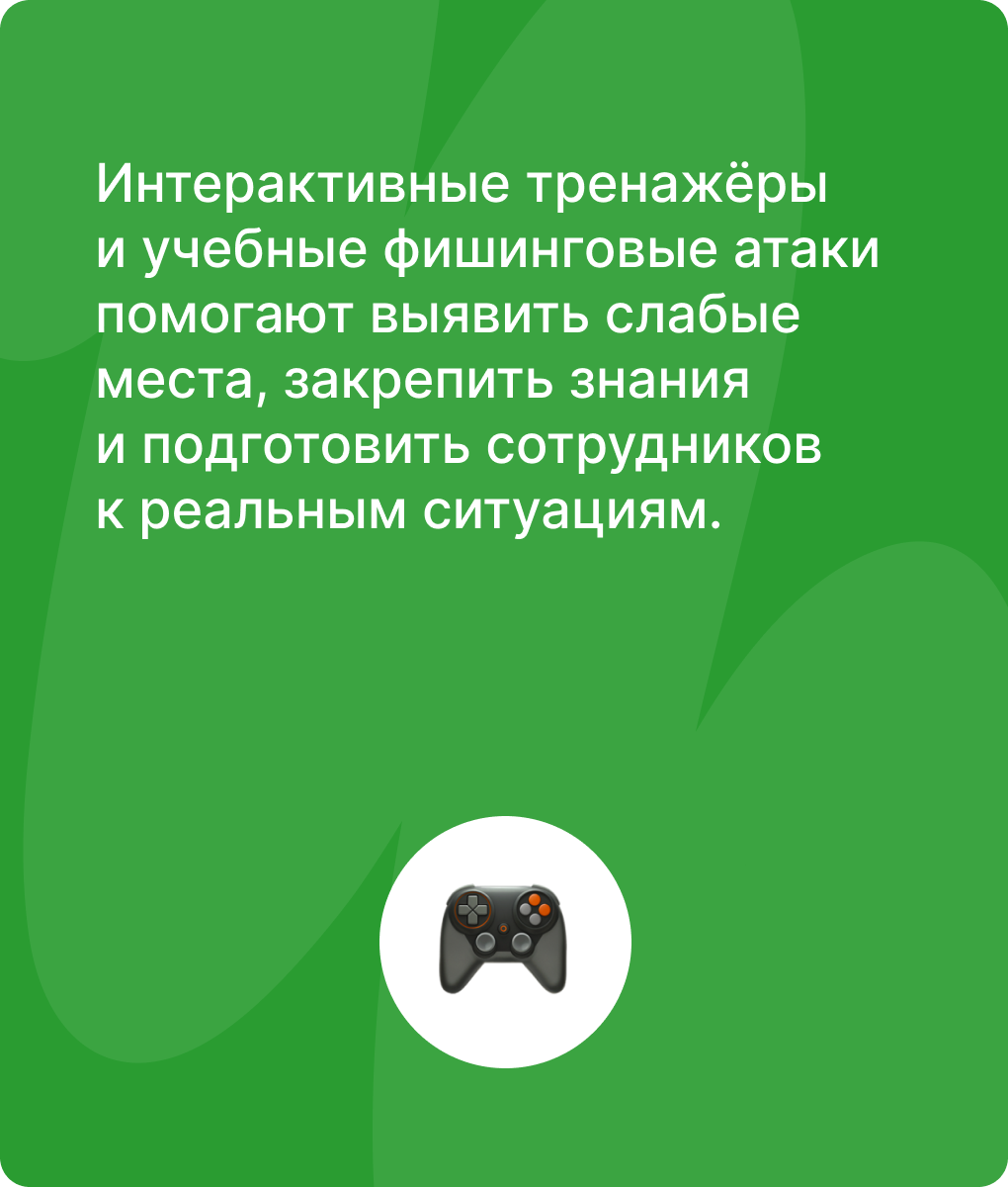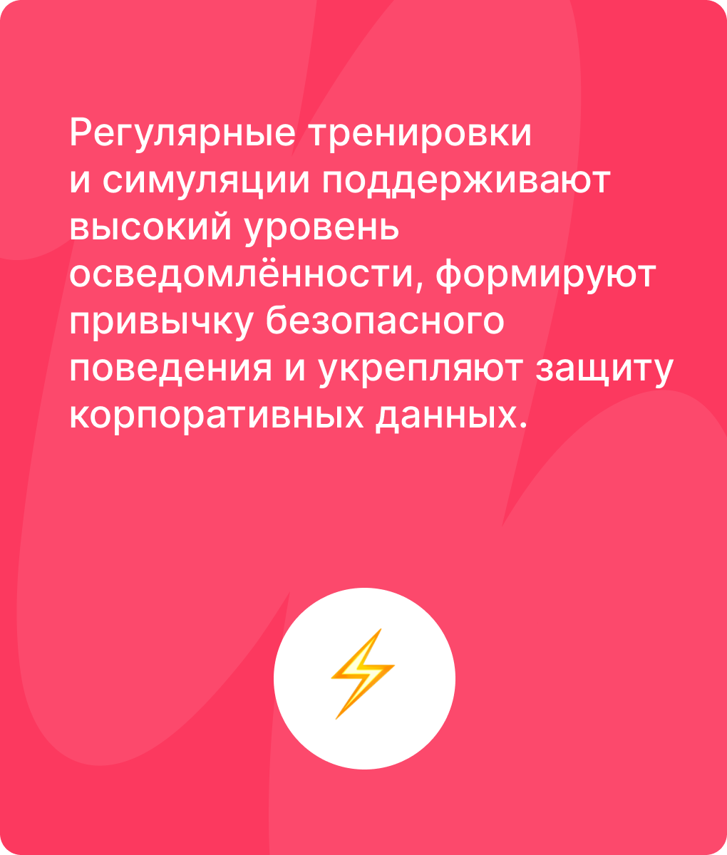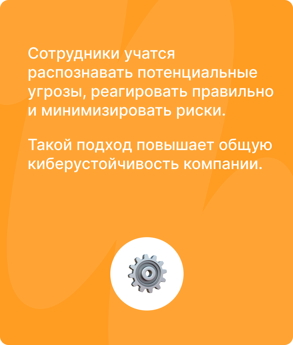 Мы развиваем навыки информационной безопасности интерактивно и с практическим фокусом, чтобы сотрудники могли распознавать и предотвращать угрозы в реальных ситуациях.